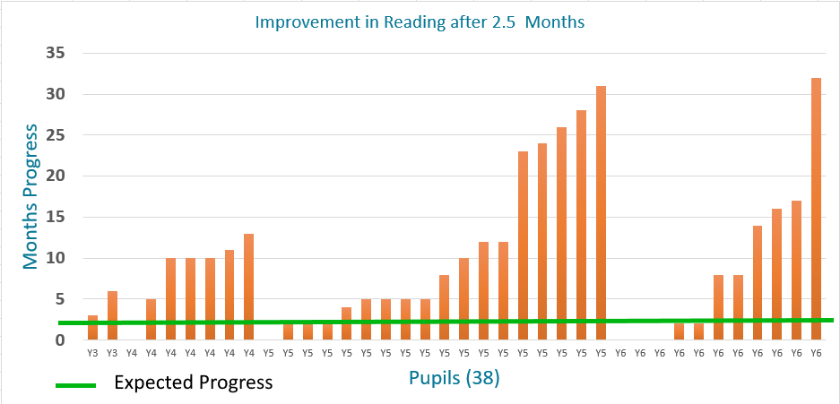 Child B had a reading age of 8y and 5m at the start of the 12 week programme and completed the programme with a reading age of 11y 0m.